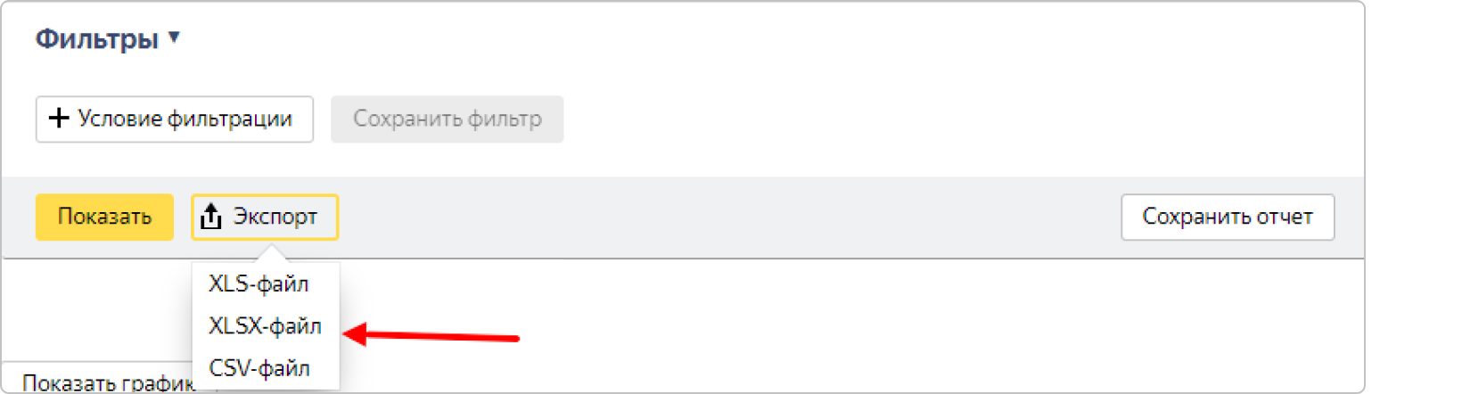 В срезах (параметрах) выбираем условие показа и при необходимости кампании. В столбцах (показателях) выбираем показы, клики, расход, ср. объем трафика, конверсии и доход (для е-ком проектов).