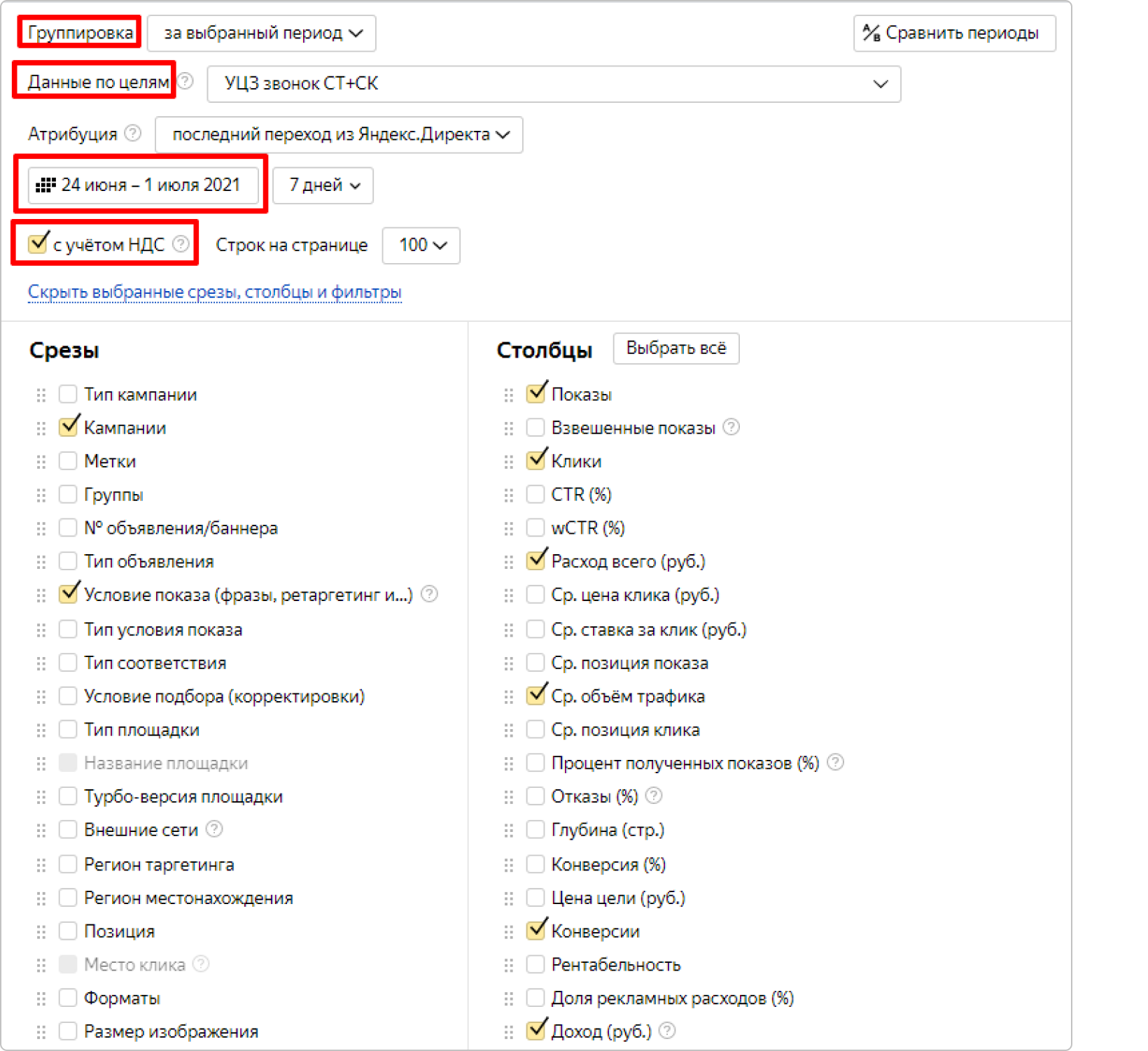 Выбираем тип группировки дат, цель, которая выгрузится в столбец «конверсии», нужные даты, при необходимости включаем галочку «НДС».