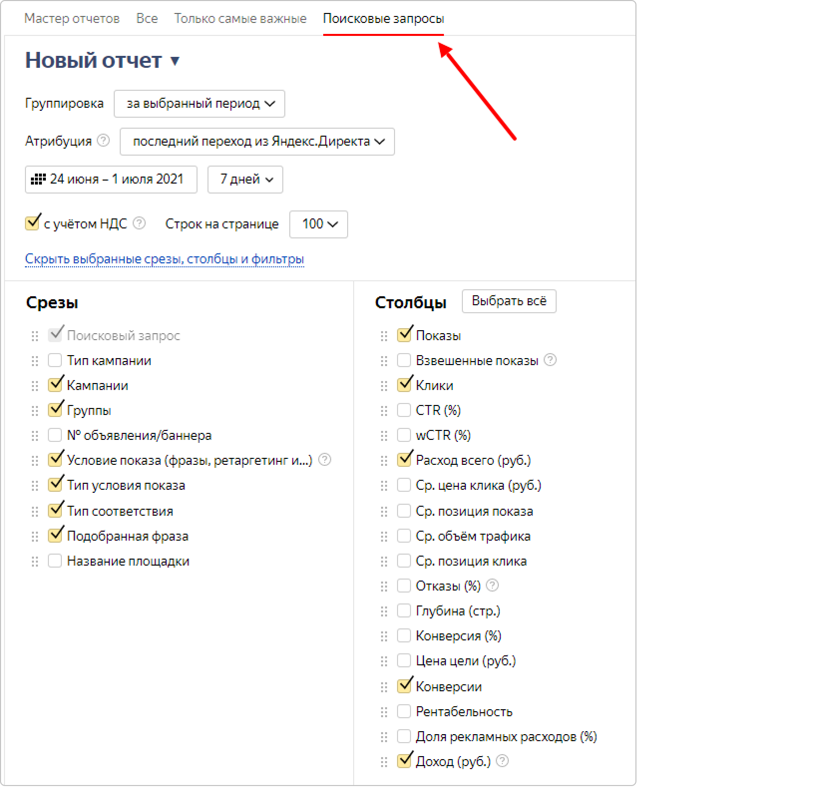 Далее выбираем нужные для анализа параметры: группировка, период, ндс, срезы и столбцы. В фильтре при необходимости можно отфильтровать нужные кампании.