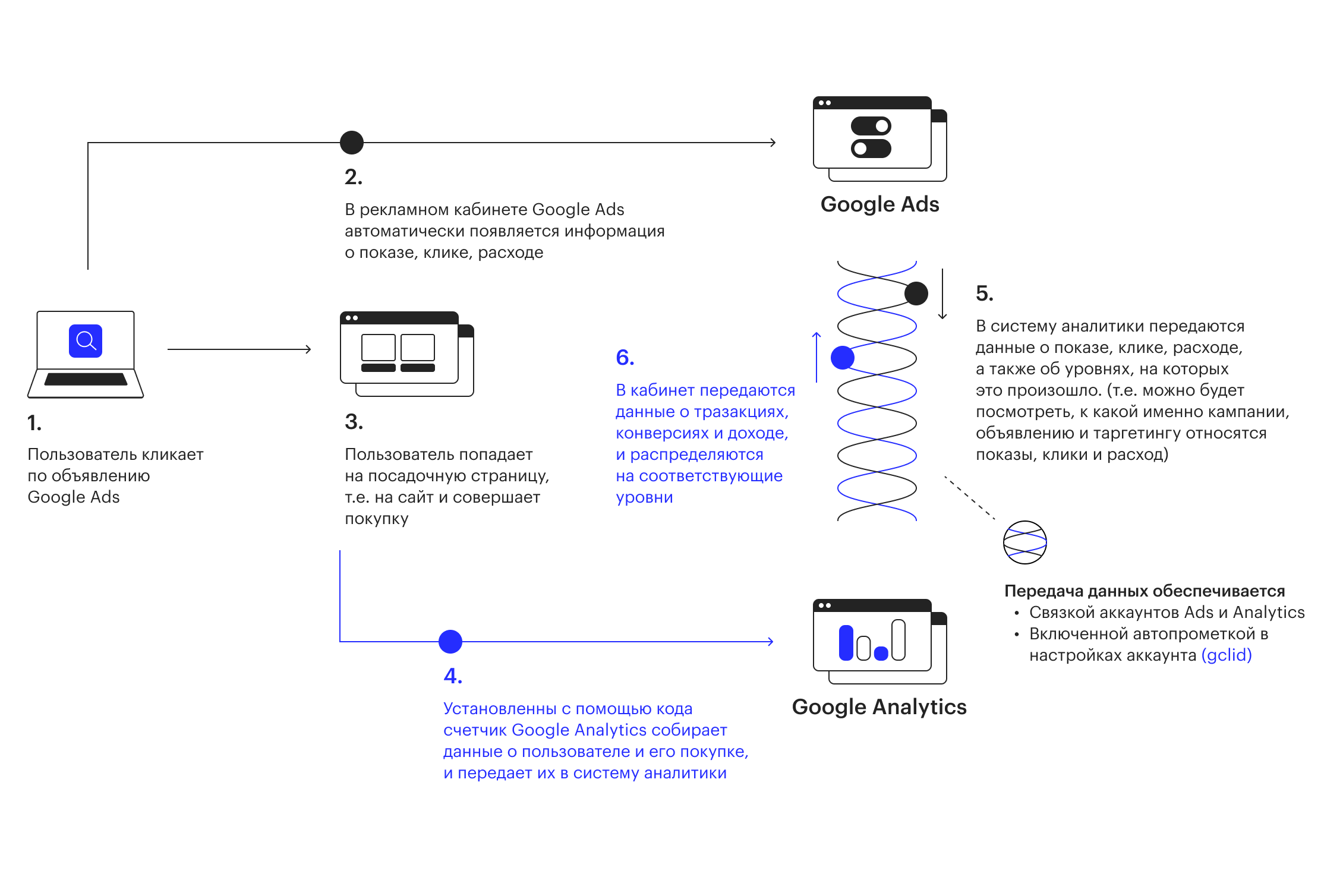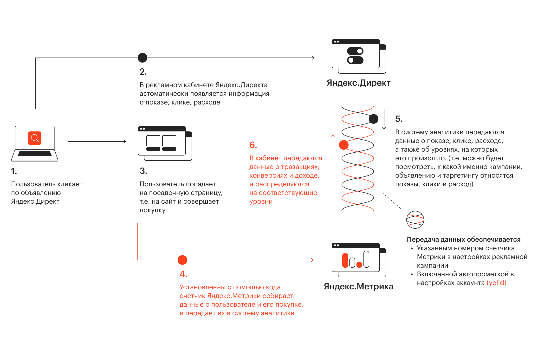 Обратите внимание, что в обоих случаях (Директ-Метрика и Ads-Analytics) для передачи данных используется автопрометка: yclid и gclid соответственно. Также происходит связка аккаунтов: