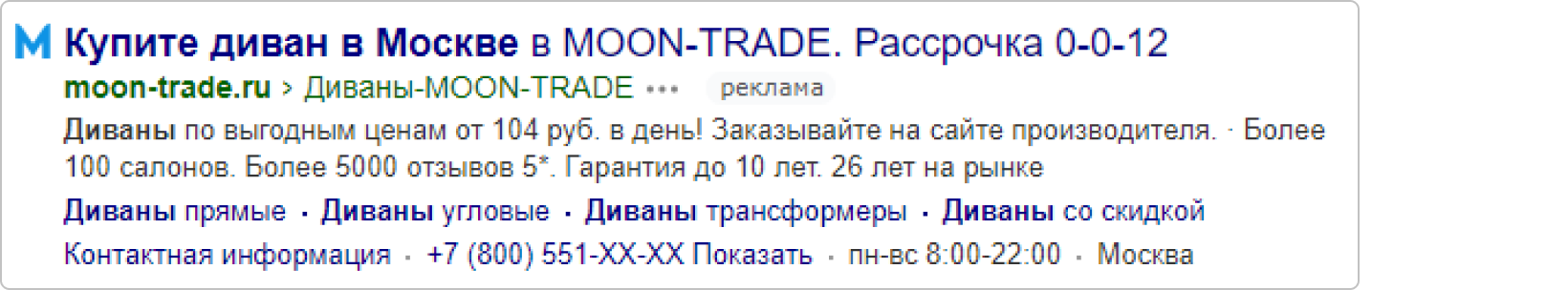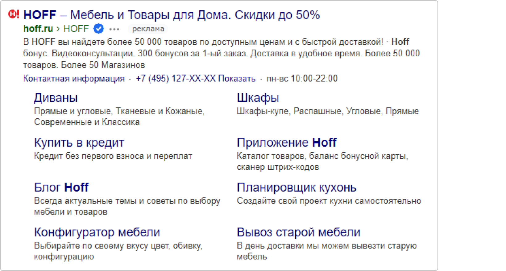 Кликабельный элемент объявления. Располагается под заголовком. Непосредственно в объявлении будет видно только домен (например, hoff.ru). Максимум 1024 символа (с учетом UTM-меток)