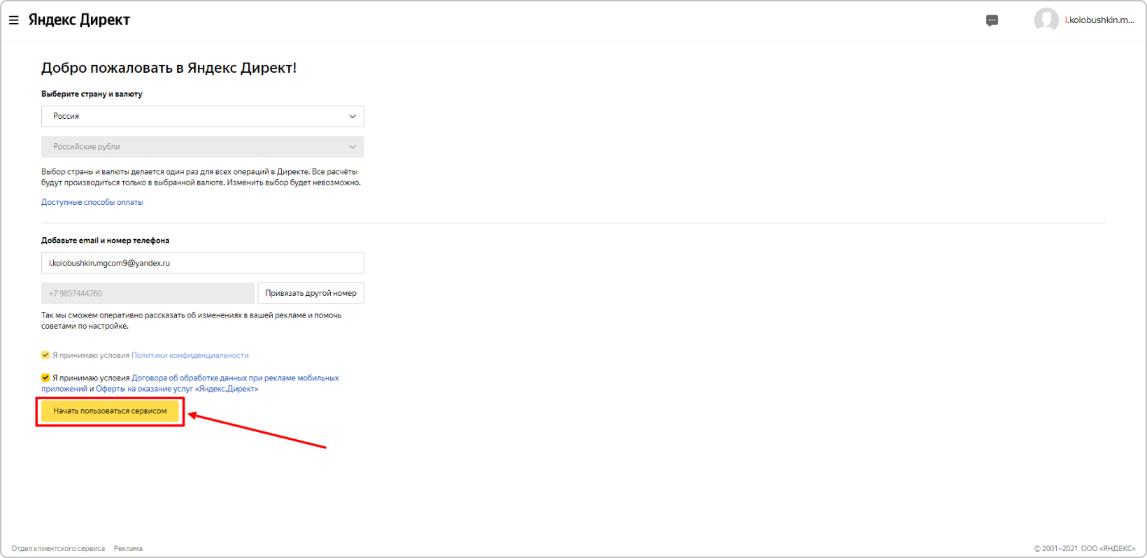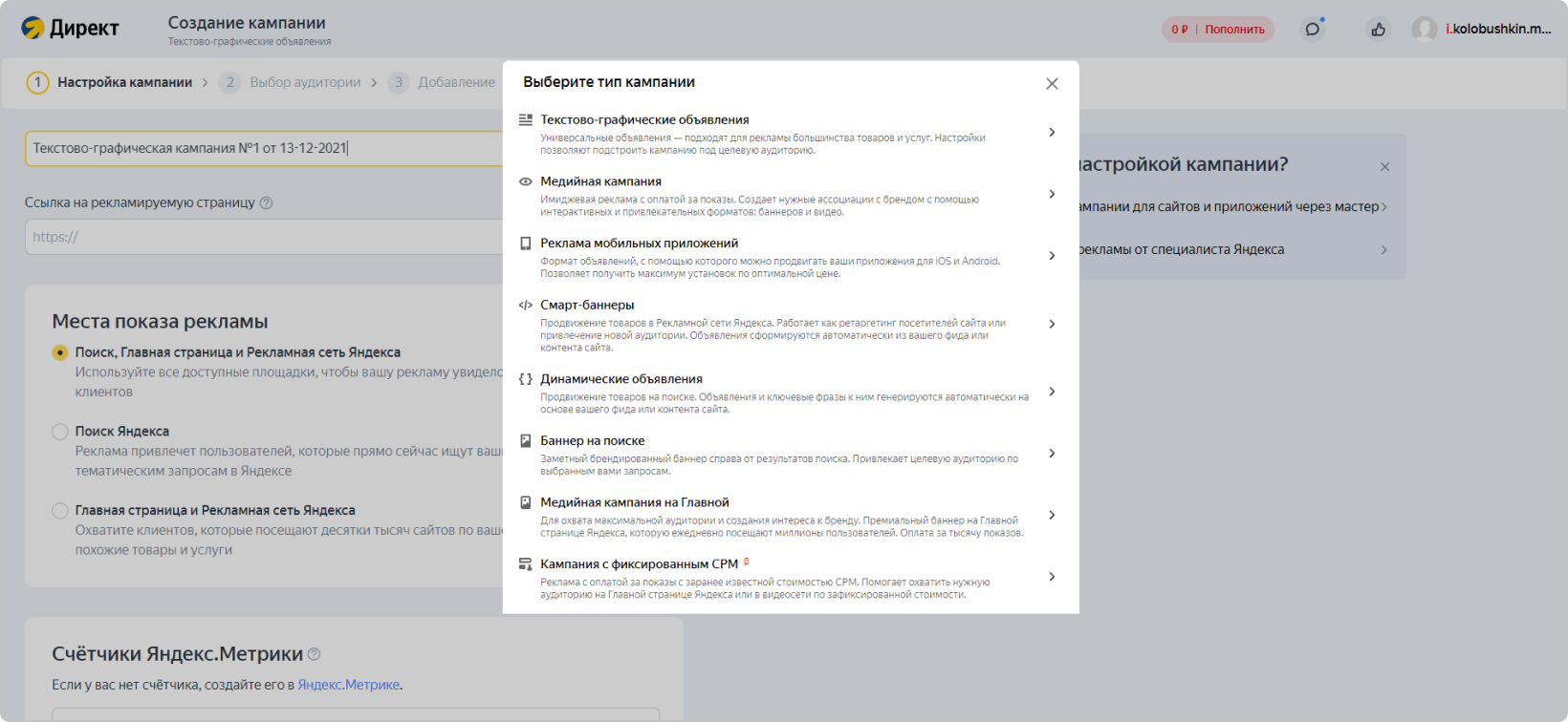 Далее Яндекс.Директ предложит создать первую кампанию
