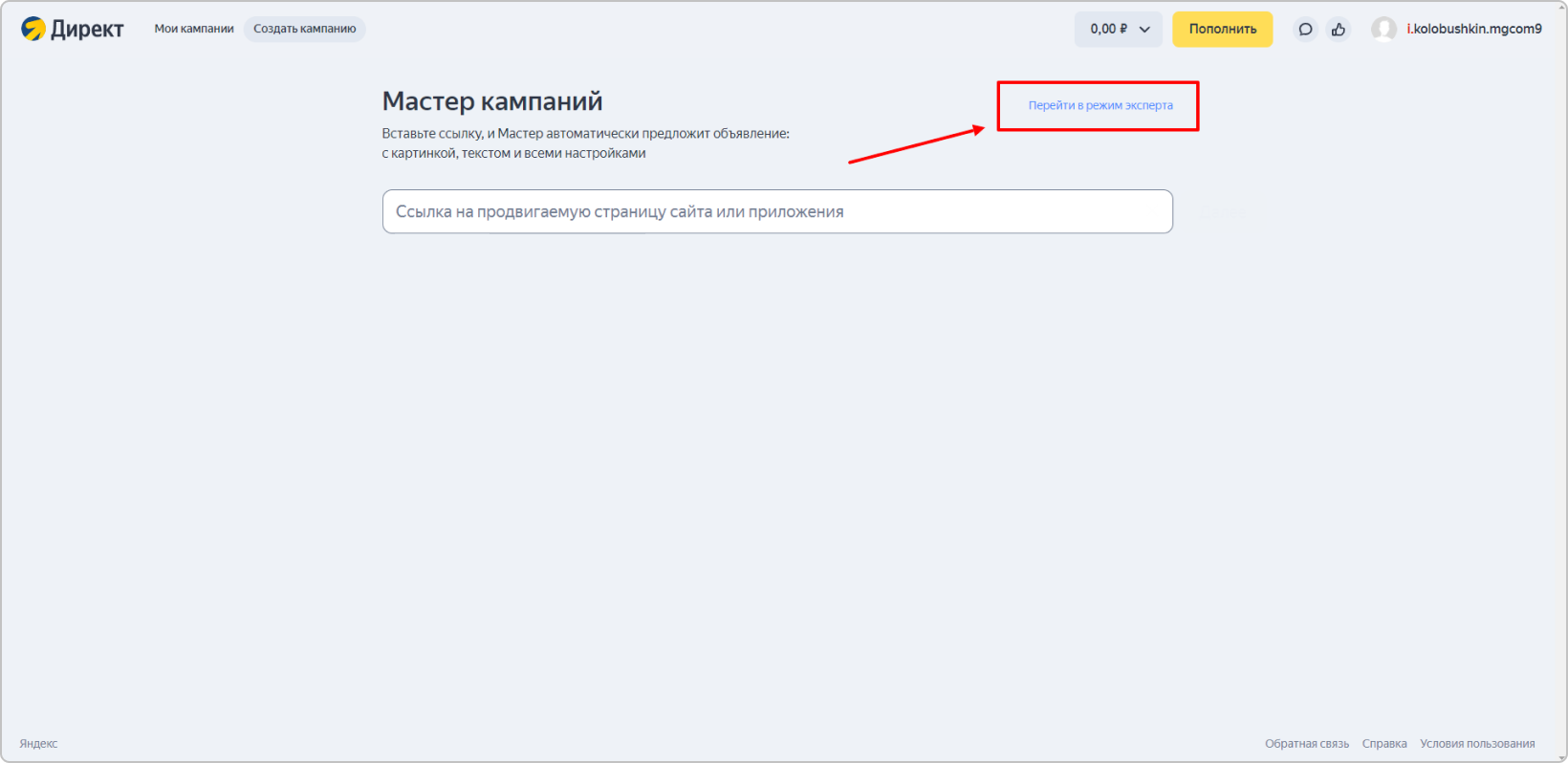 Нам это сейчас не нужно, т.к. мы будем создавать кампании с помощью заливочного файла и специальной программы Директ Коммандер. Поэтому пока что можно просто закрыть вкладку.