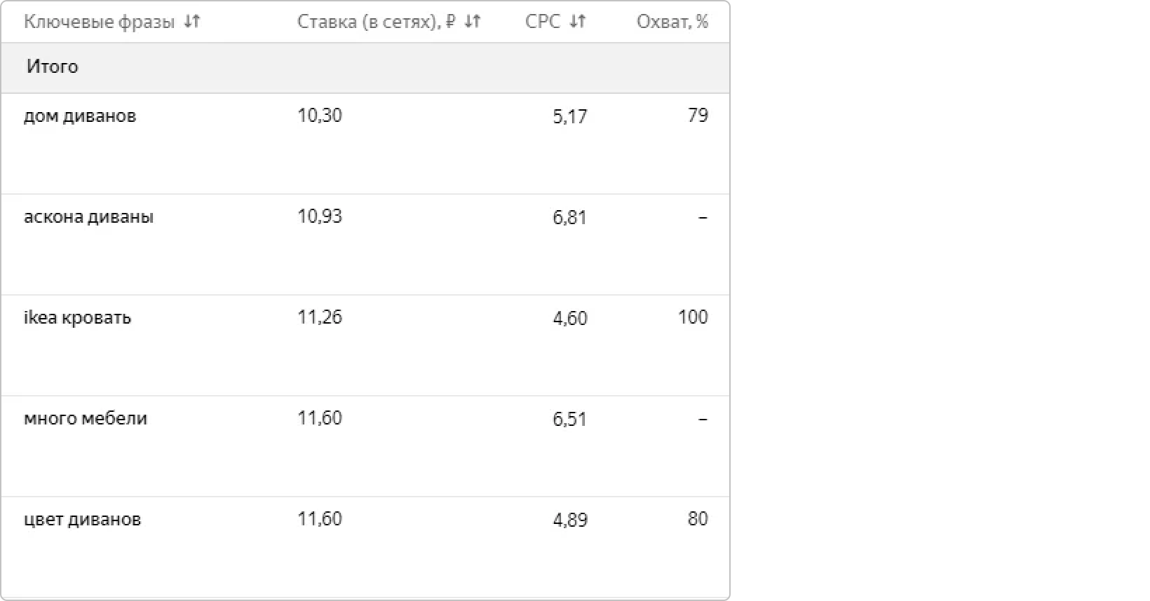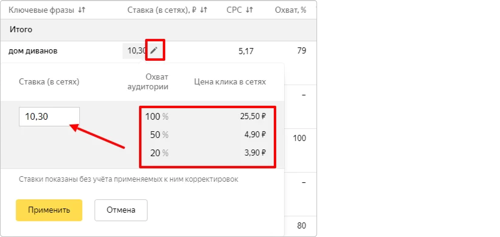 Также далеко не у всех ключей есть прогноз аукциона и охвата. В таком случае приходится ставить что-то среднее по болоту: смотрите ставки у соседних похожих ключей (у которых есть прогноз) и ставите ставки такого же порядка.