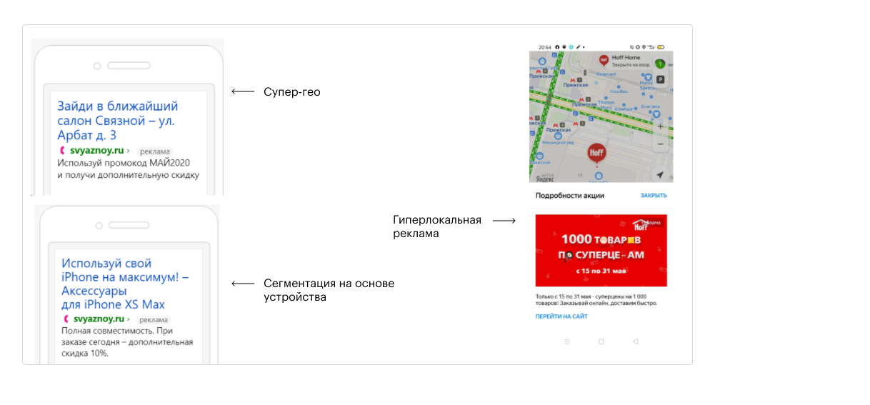 К примеру, можно запустить рекламу вблизи точек продаж и использовать релевантные УТП для момента, в котором находится аудитория. Или отдельно таргетироваться на тех, у кого операционная система iOS и в объявлении рекламировать Apple аксессуары.