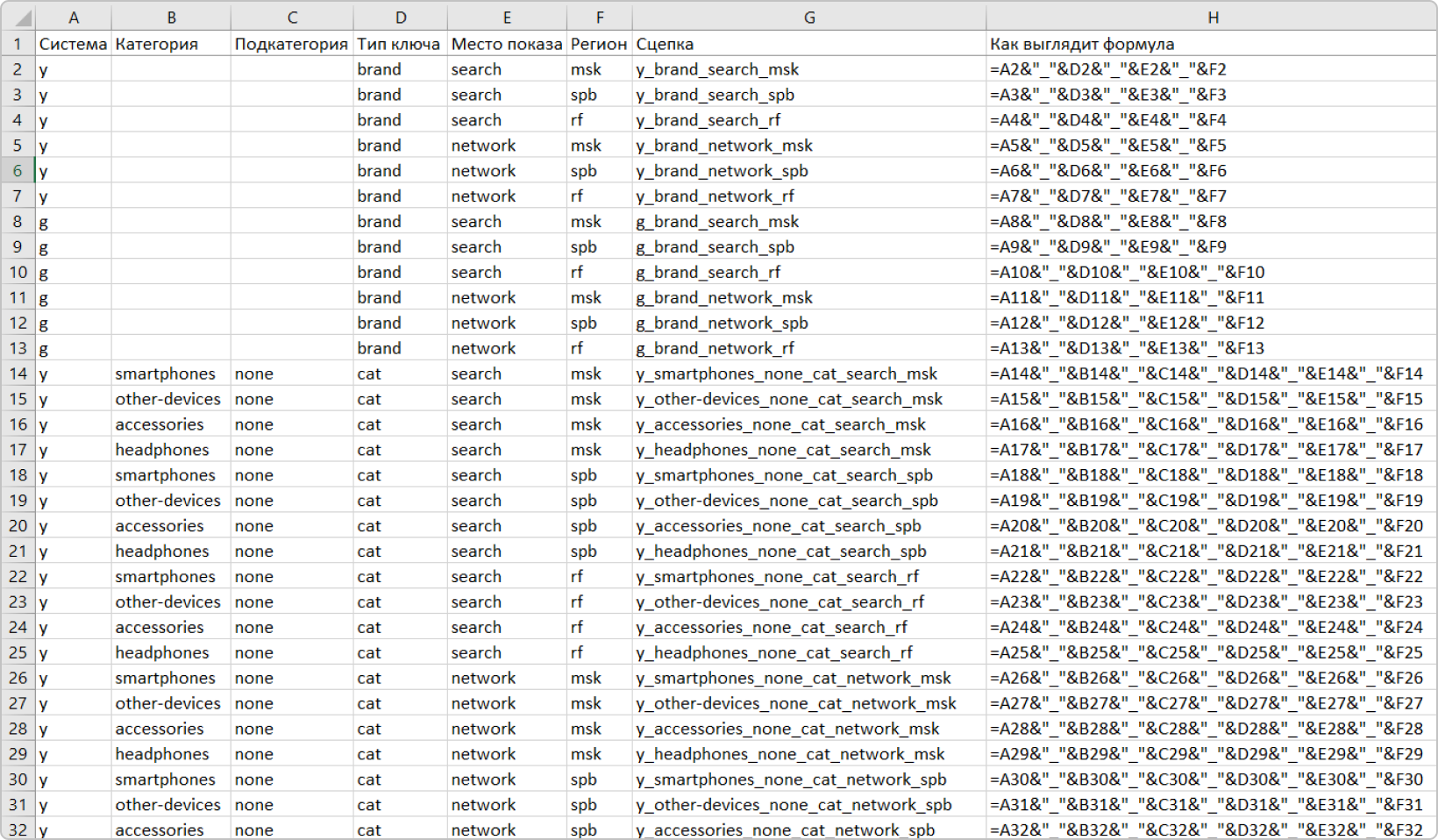 Но т.к. брендовые кампании имеют меньше количество элементов (система, тип, место и регион) сцеплять нужно будет отдельной формулой. Для удобства давайте отсортируем по бренду и пропишем формулу сцепки.