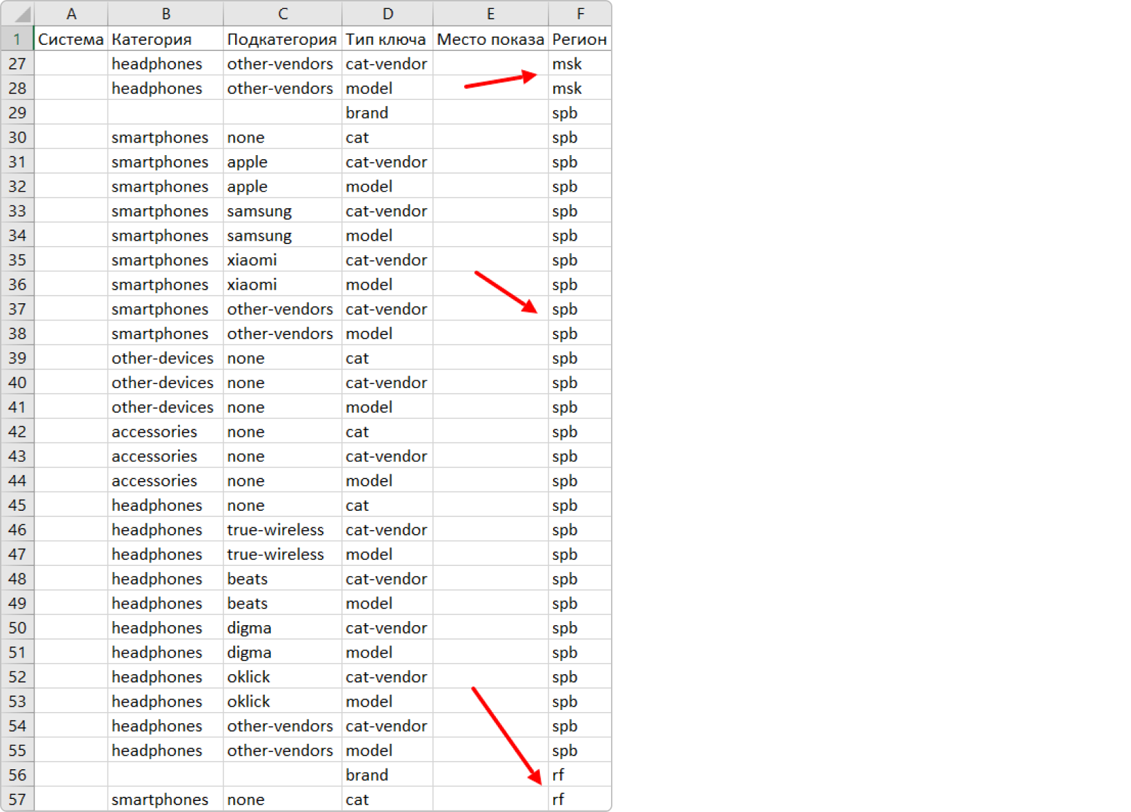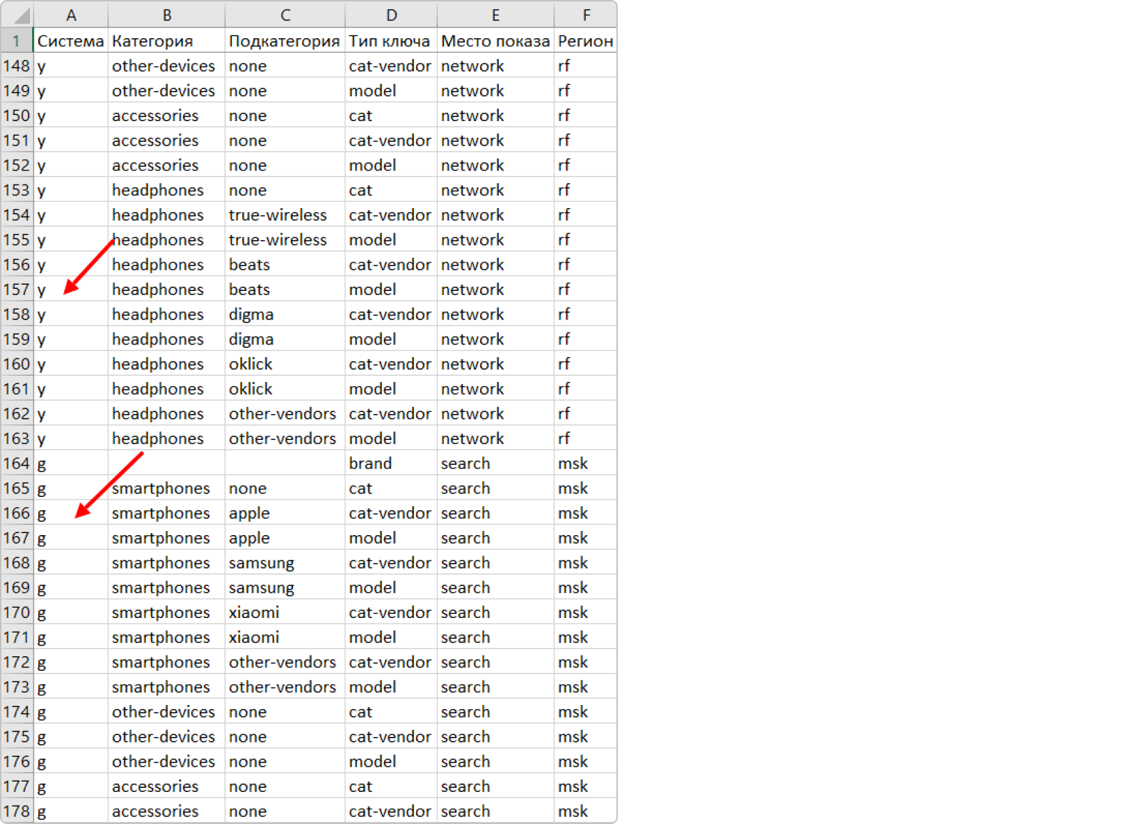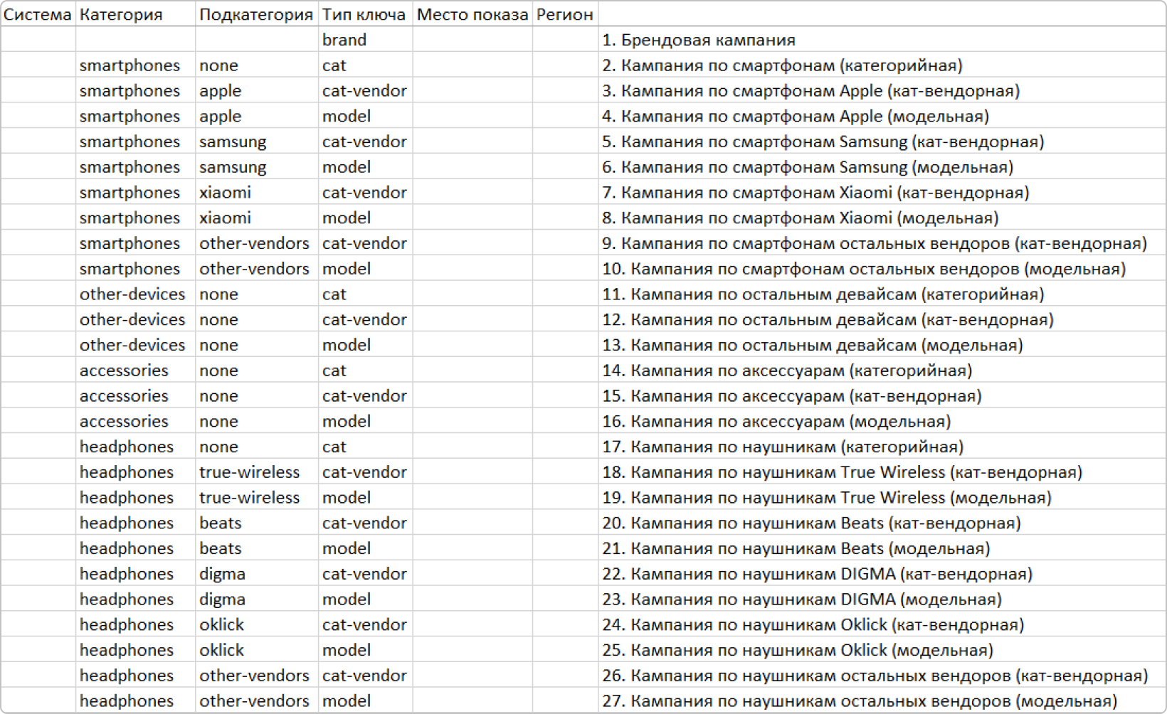 Давайте сделаем нейминг кампаний на примере e-com проекта. Для начала перенесем в специальную таблицу основу сегментации — 27 кампаний разбитых по категориям, подкатегориям и типам ключей: