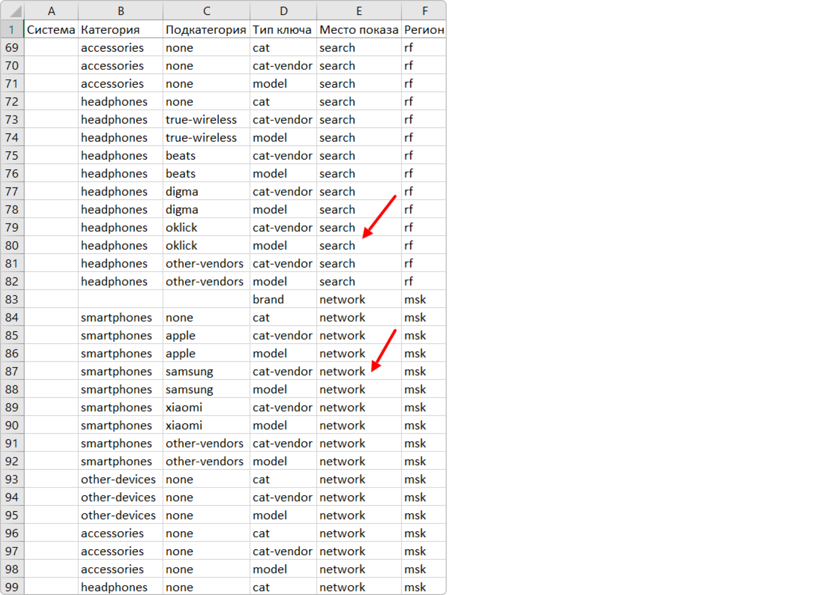Теперь проставим место показа "search" (поиск), скопируем вниз полученную таблицу один раз и проставим место показа "network" (сеть).