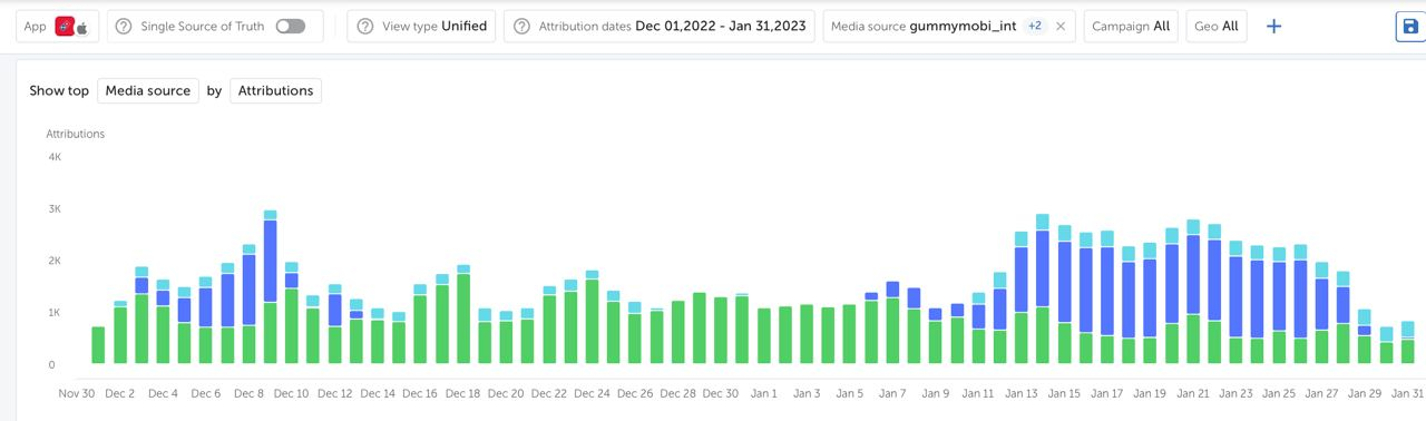Видим, что после запуска In-app трафика с 11 января (на скрине отмечены синим и голубым) происходит падение органики (зеленое).