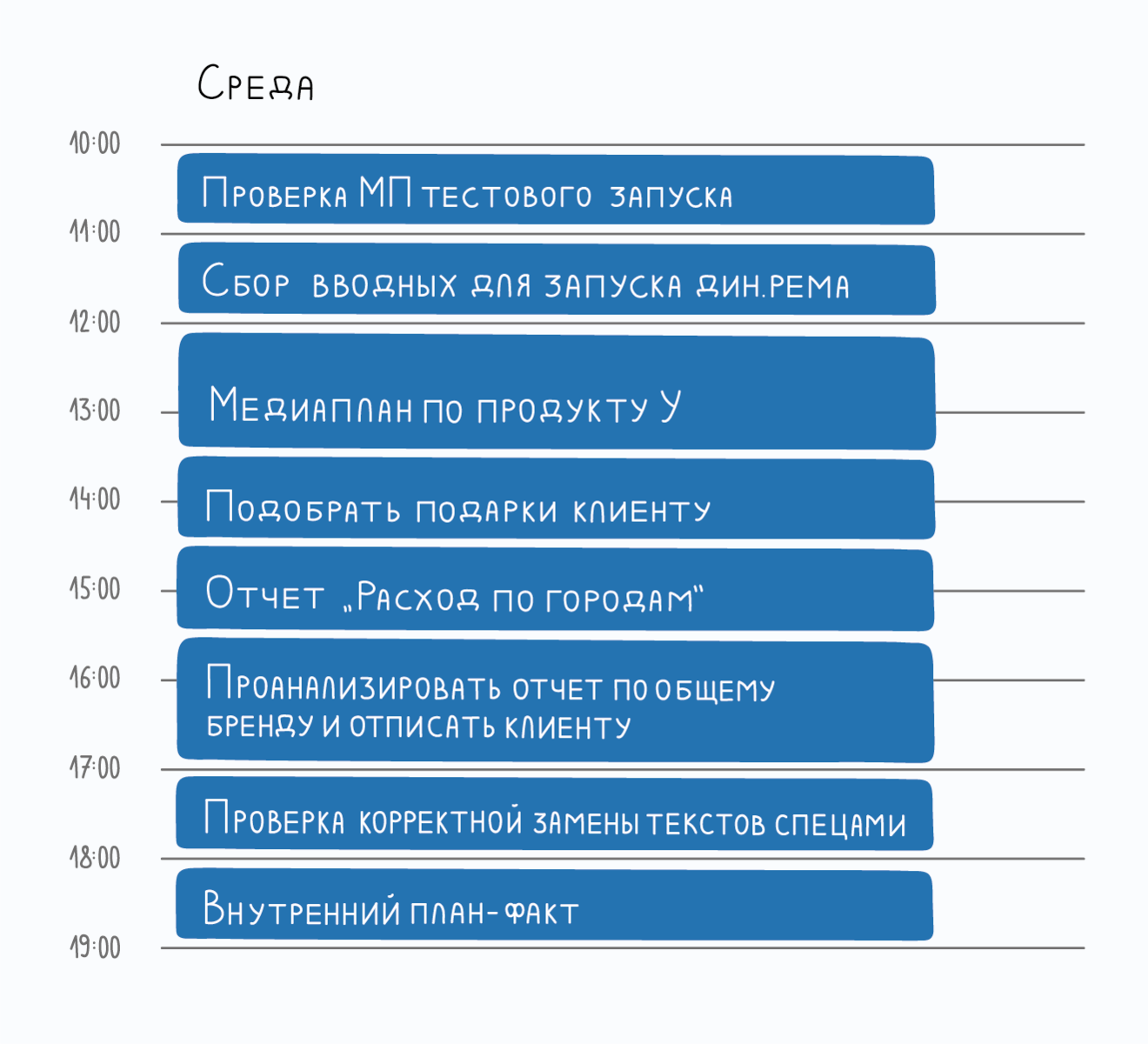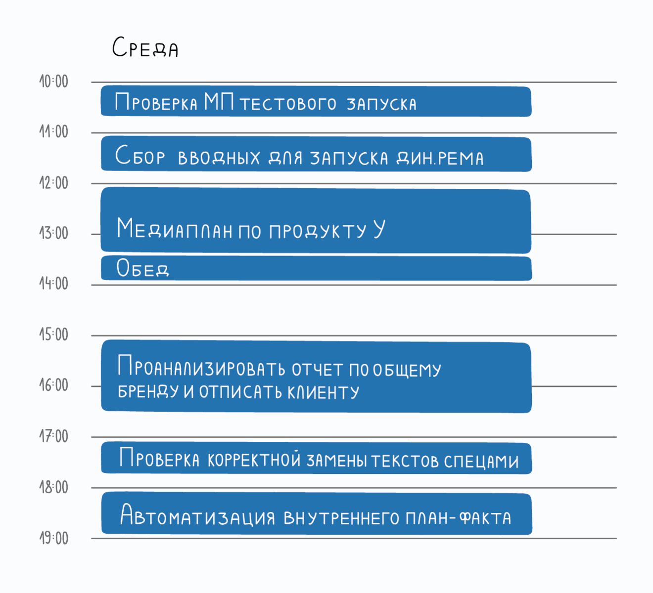 Задачи идут одна за одной, без перерывов. Нет ни минуты свободного времени, которое точно понадобится, если влетит неожиданная «горящая» задача или, как назло, обнаружится факап. И вообще, а где здесь обед?