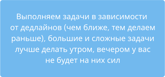 Как это использовать? Группируй задачи по выбранному критерию и выполняй их в комплексе. Например, так: Блок 1: Отчетность — лучше делать все отчеты (если они собираются в одном софте) одновременно; Блок 2: Оптимизация — лучше делать ее по всем проектам в одно время, т.к. работа очень схожа. Блок 3: Коммуникация. Писать сообщения и отвечать на все входящие запросы удобнее за один раз.