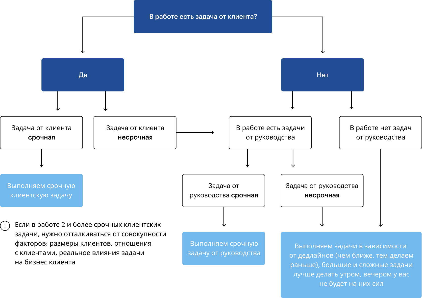 Таким образом: 1. Приоритет № 1 — клиентские задачи 2. Далее выполняются задачи от руководства или текущие задачи по проекту 3. Последними выполняются задачи по прокачке маржинальности текущих площадок и поиску новых.