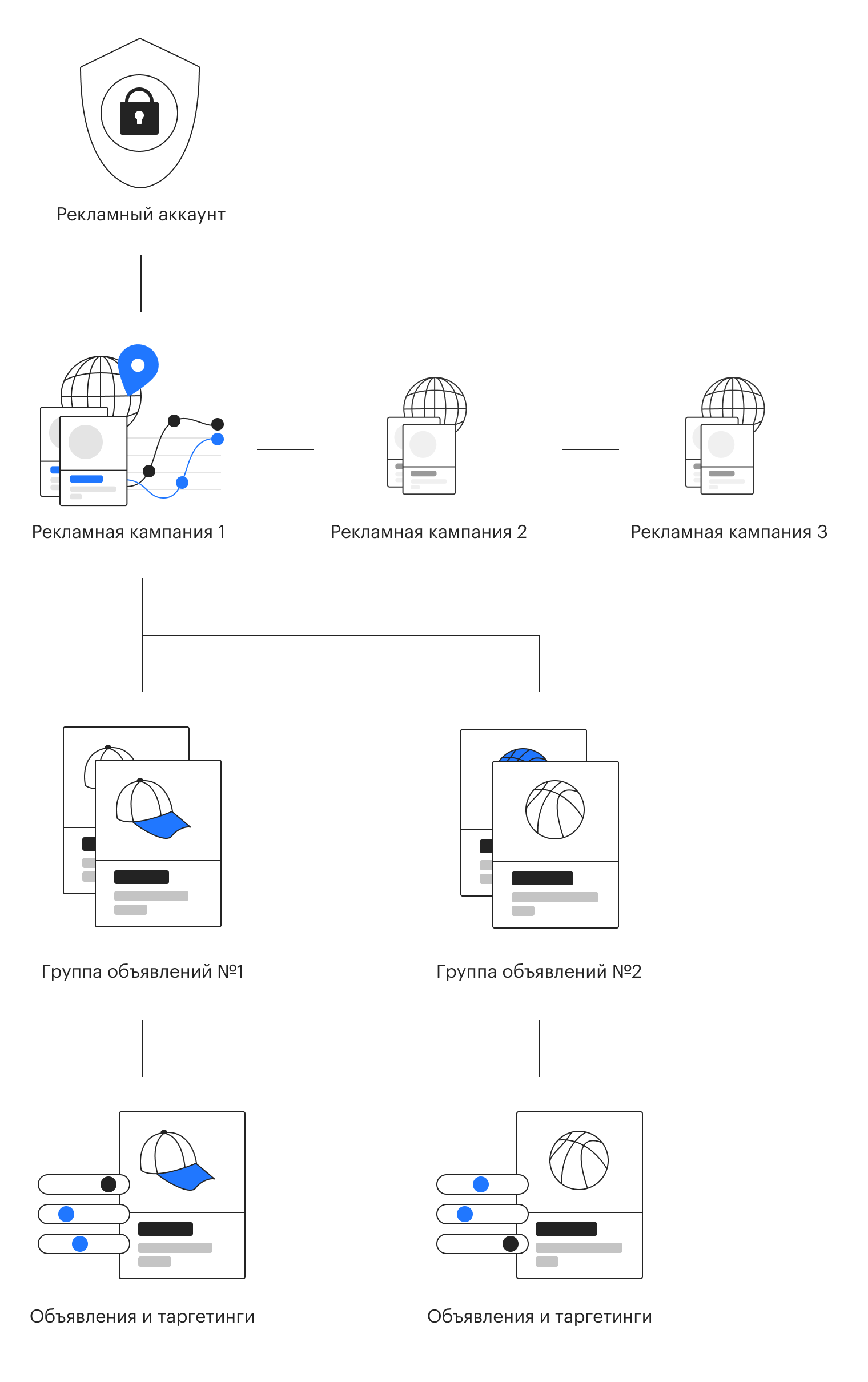 При заведении кампаний внутри аккаунта нужно придерживаться логичной структуры. Разбивку РК обычно делают на основе их ожидаемой или текущей эффективности, что позволяет в дальнейшем: