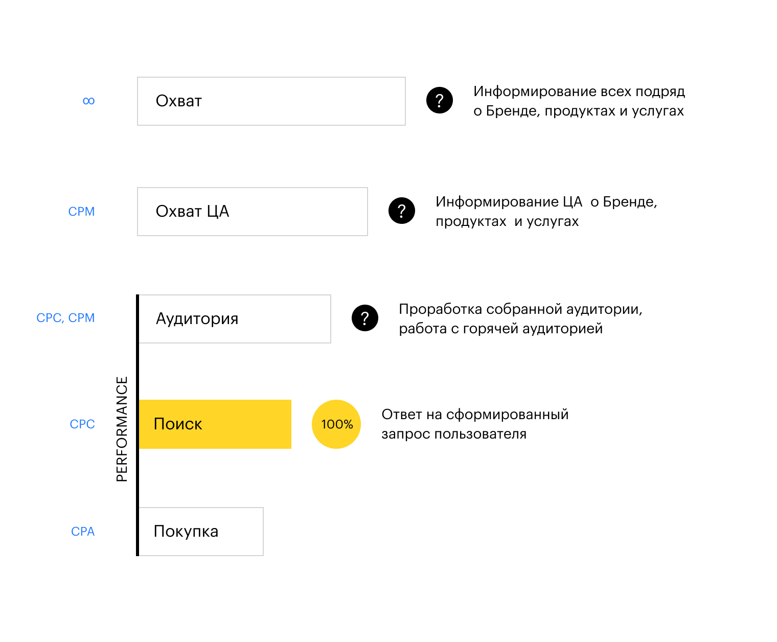 Пример — в качестве таргетинга выбираем супер горячую аудиторию по базе CRM для транслирования повторных продаж. Стоимость конверсии будет намного дешевле, чем с широкой холодной аудитории. Но CPC или CPM с высокой долей вероятности будут дорогими. С течением времени эта база выгорит и начнёт приносить уже конверсии по более дорогой цене