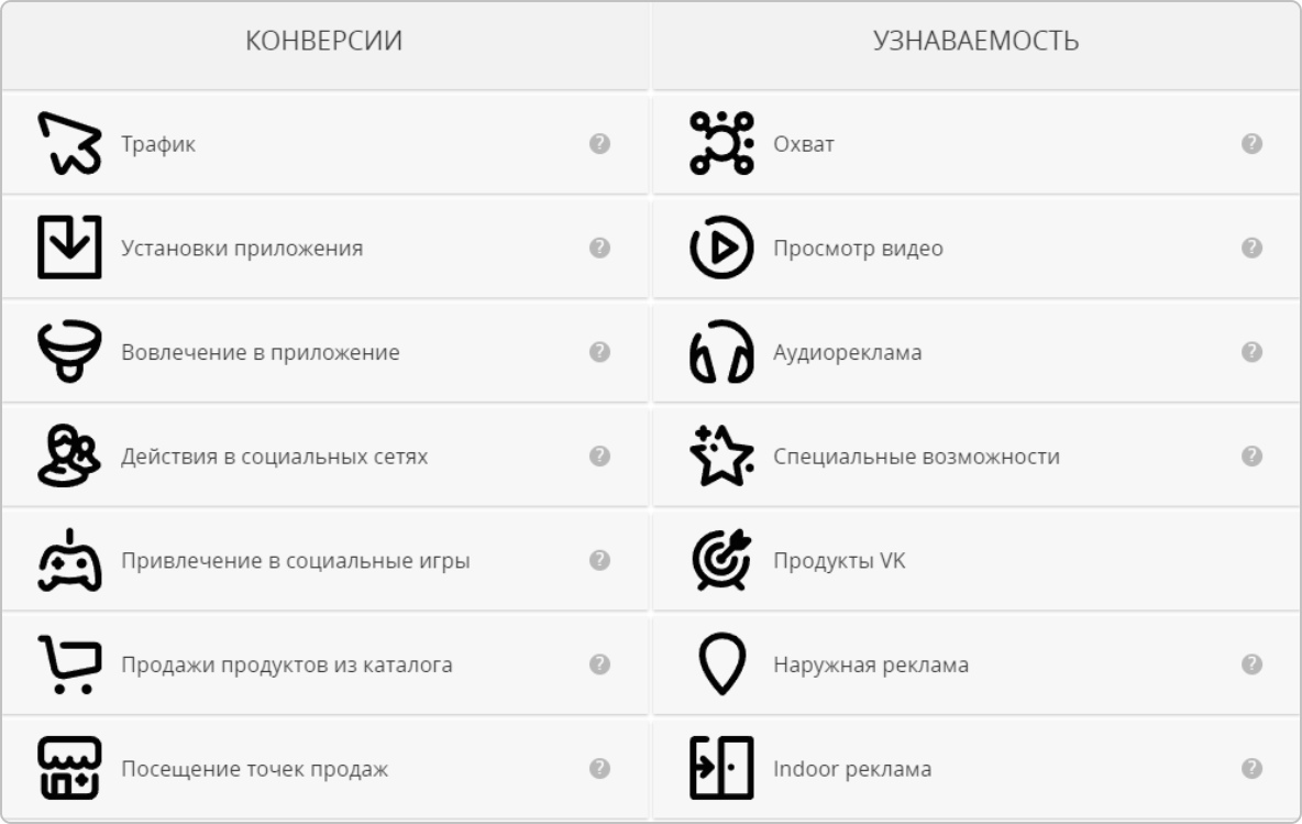Данная группа включает в себя типы кампаний, которые подходят для медийного продвижения бренда. Коротко о типах: