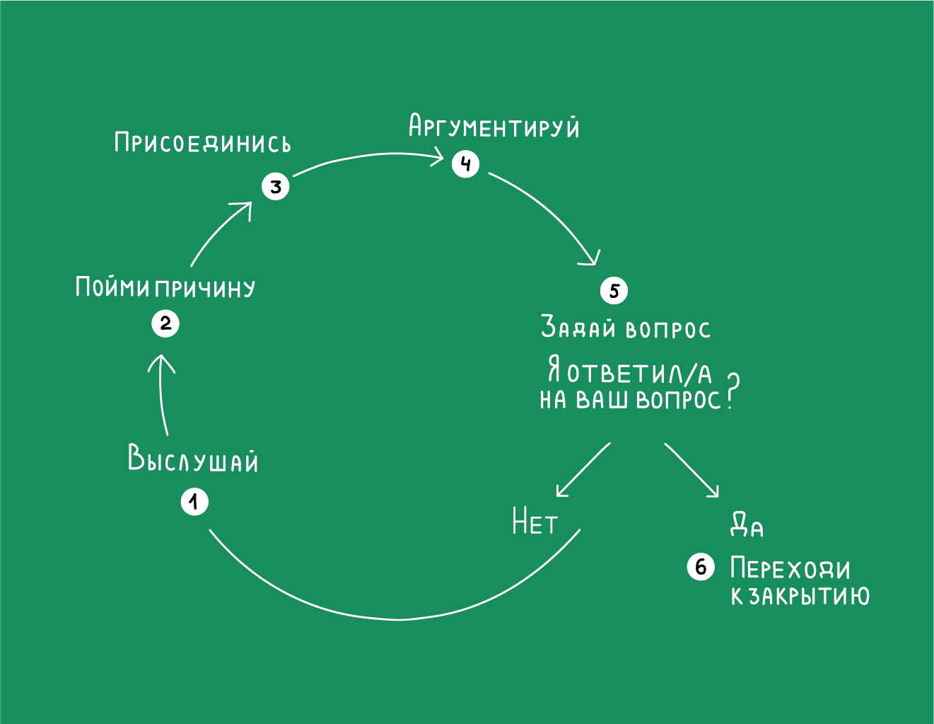 Мы описали основные причины, почему возникают возражения, и что с ними нужно делать. А теперь добавим механику в твою отработку возражений для достижения взаимопонимания с партнёром — разберем пошагово процесс отработки возражений.